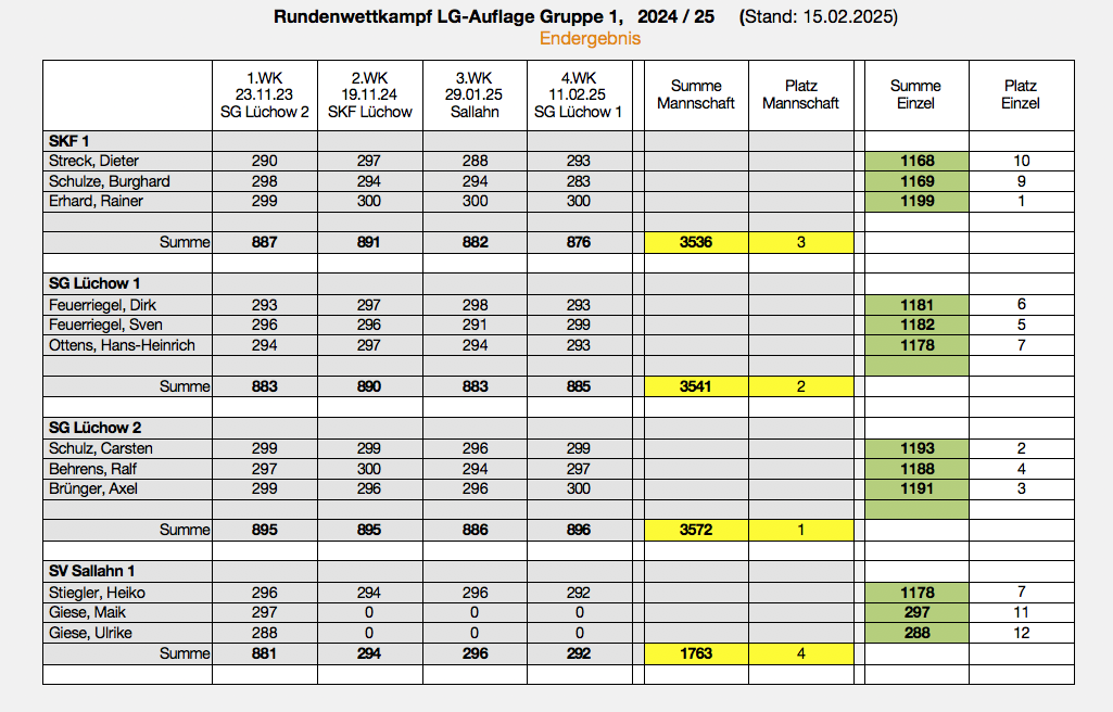 Mannschaftswertung Senioren 1: SKF Lüchow 2 (Erhard, Meyer, Hüsing): 2. Platz mit 936,4 Ringen