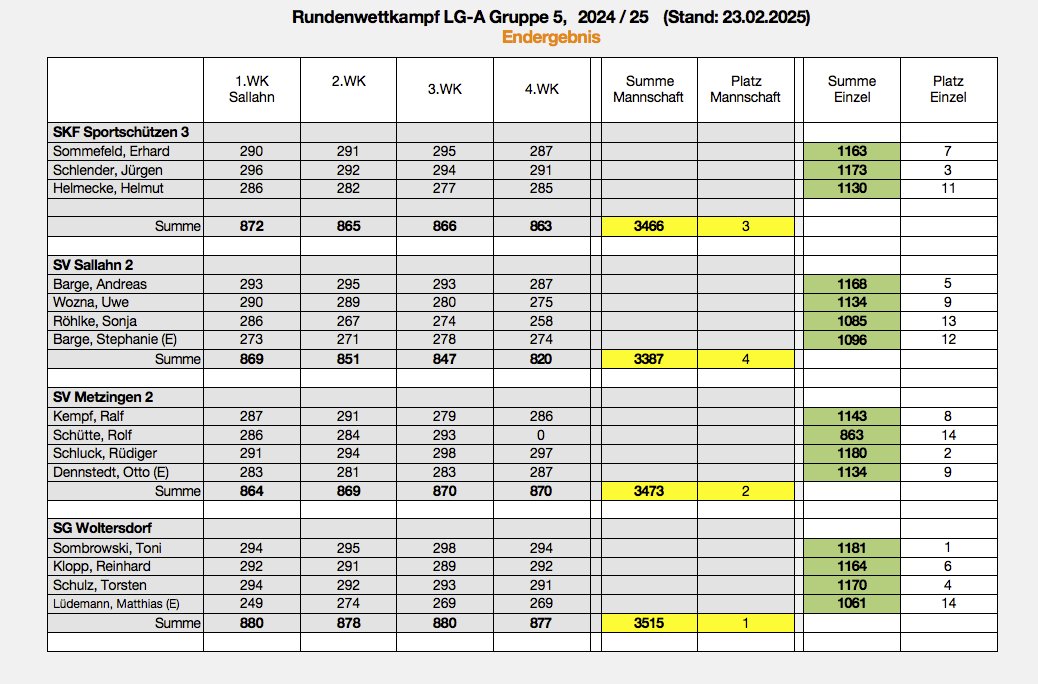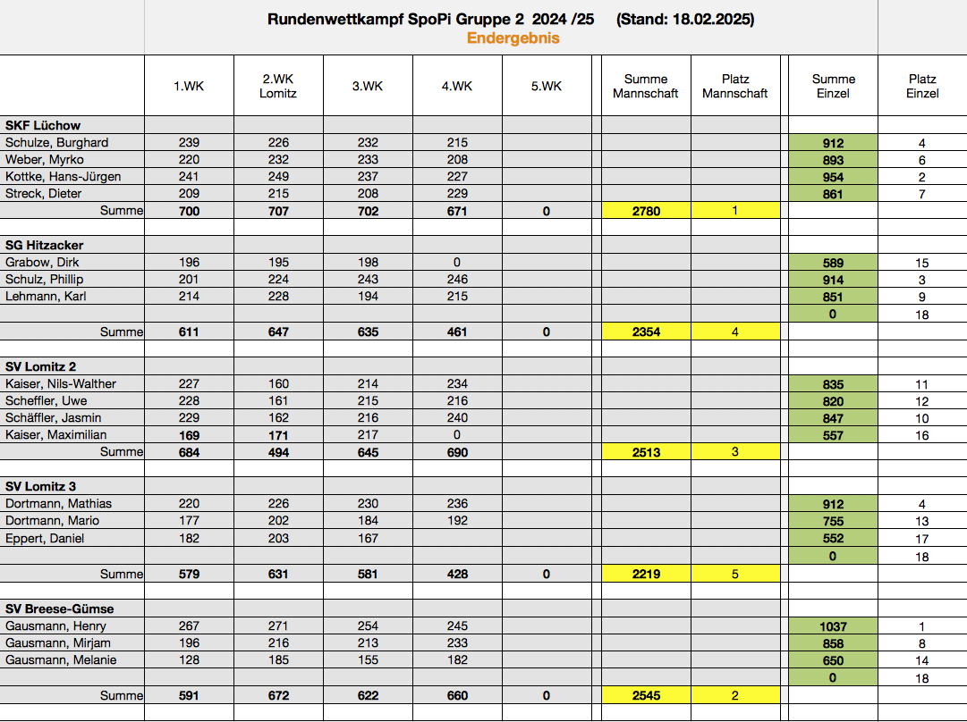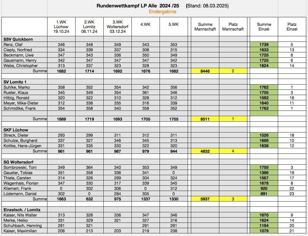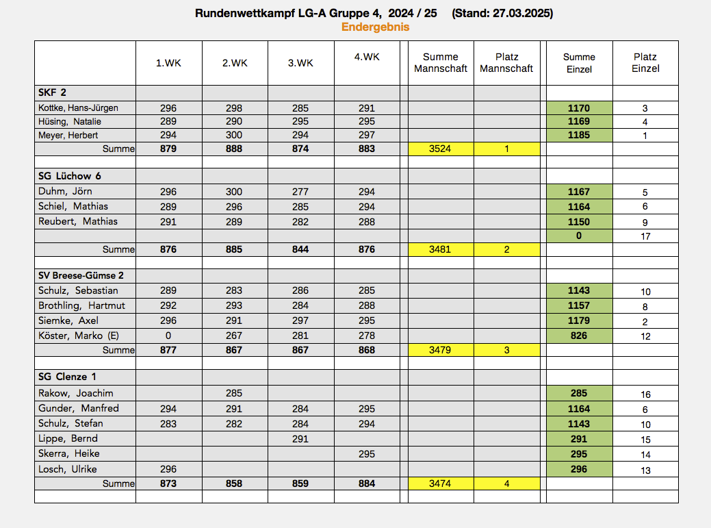 Die Sportpistolenschützen der SKF-Sportschützen (Burghard Schulze, Myrko Weber, Hans-Jürgen Kottke, Dieter Streck) belegten im Rundenwettkampf 2024/25 mit der Mannschaft den ersten Platz. In der Einzelwertung sicherte sich H.J. Kottke Silber.