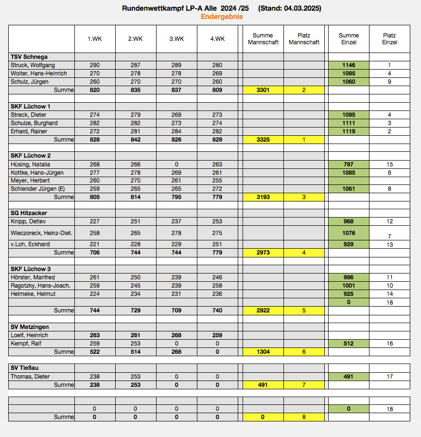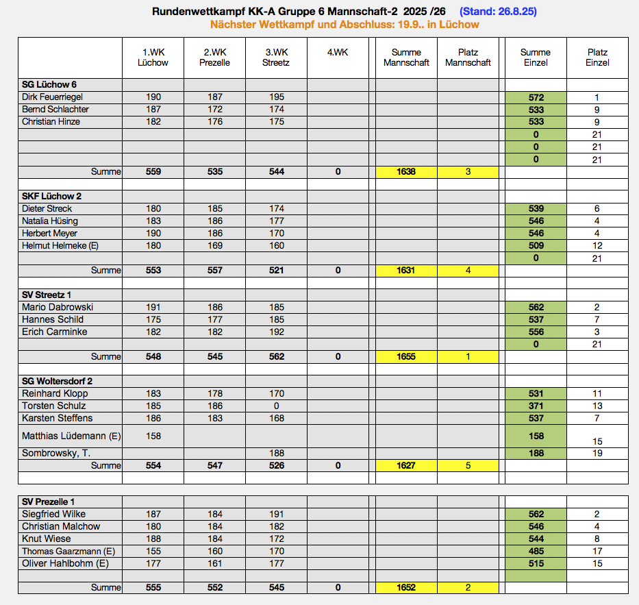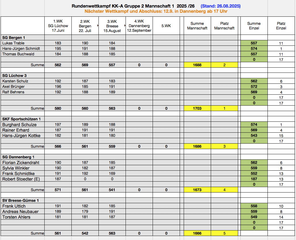 Bei der Kreismeisterschaft 2025 in der Klasse Senioren III gewann die Mannschaft III mit Burghard Schulze, Hans Jürgen Kottke und Dieter Streck Bronze mit 906,4 Ringen.