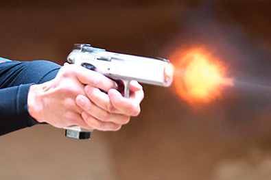 Hier wird das Geschoss nicht durch komprimierte Luft aus einer Kartusche in Richtung Ziel befördert, sondern durch den Druck, der beim Zünden der mit Pulver gefüllten Patrone entsteht. Dadurch entsteht auch ein fühlbarer Rückstoß. Zum Erwerb einer solchen Waffe gibt es gesetzliche Vorschriften und eine Wartezeit. Es kann aber auch problemlos jede:r mit den Vereinswaffen üben, die Gästen zur Verfügung stehen.